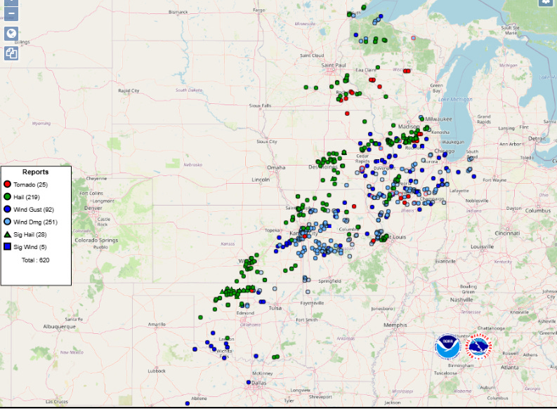Turning to weather, the severe weather outbreak anticipated for Friday worked out about as anticipated. The large number of storms led to a lot of interactions between storms which helped keep the tornado situation from getting out of hand, but there were still a number of tornadoes reported across the Midwest. The most significant ones appear to have occurred in parts of Wisconsin and northwest Illinois where several locations had serious damage. Intense lines of severe storms caused extensive straight line wind damage across parts of Wisconsin, Illinois and Missouri leaving more than 100,000 customers without power at the peak of the storms last night. Nearly 30 reports of very large hail (greater than 2”) were scattered from northern Oklahoma to the upper Mississippi Valley.