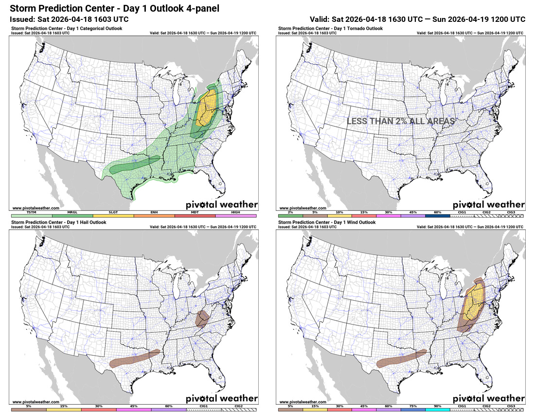 Today should be a much tamer day as far as severe weather, but a few severe storms are possible along the cold front shifting to the southeast. A slight (level 2 of 5) risk is in place in the eastern Great Lakes and middle Appalachian regions where a few severe storms with damaging wind are possible along the front this afternoon and evening.
