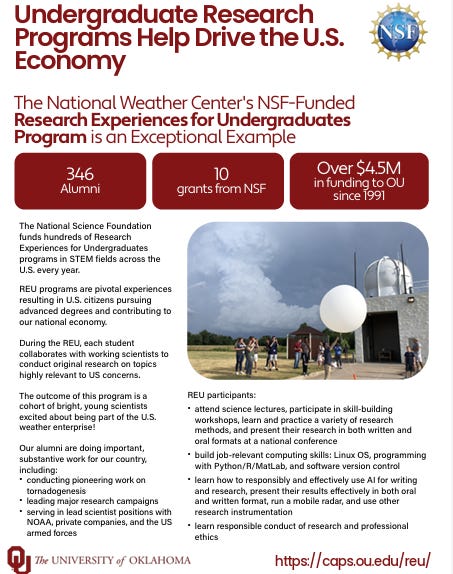 Yesterday Dr. Daphne LaDue, the longtime head of longtime Research Experience for Undergraduates (REU) atmospheric and geographic sciences program at the University of Oklahoma, announced on social media that for this first time since 2006 that this special summer program will not be happening this year. REU is an NSF sponsored program that provides funding for universities to host programs that enable undergraduate students to work with faculty and other researchers on a summer research project in their field. NSF has for decades supported many REU programs around the country in all of the science and technology fields that the agency supports.