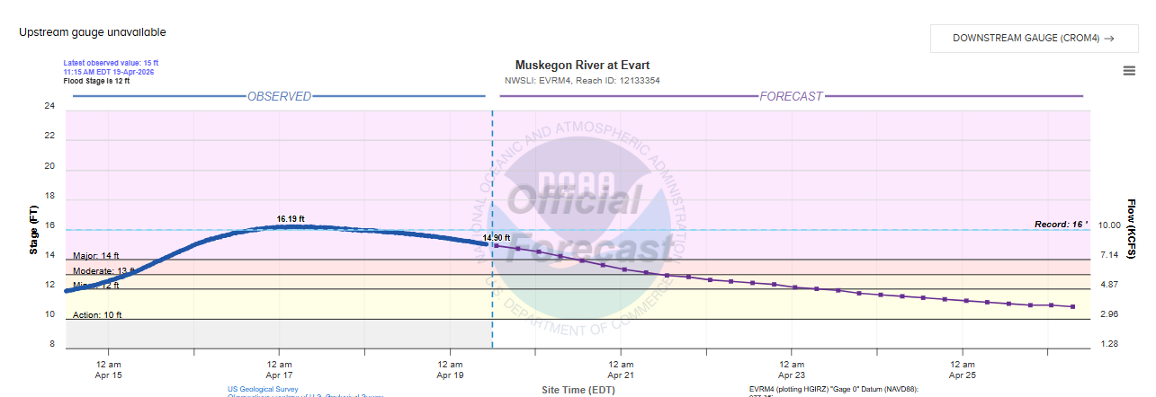 An upstream gauge at Evart also set a new record stage, and records here go back to at least the early 1930s.