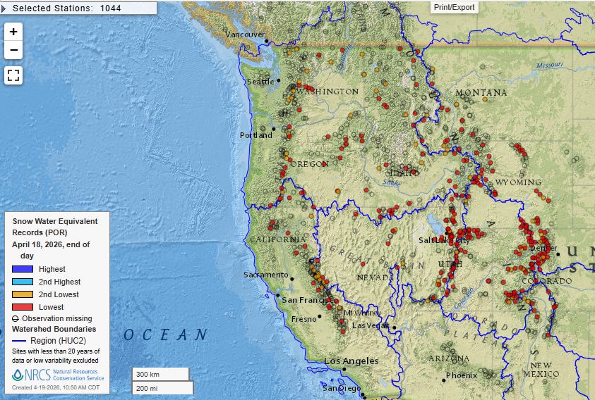 All of these stations marked with red dots observed their lowest snow water equivalent (SWE) on record for the date yesterday, with the orange dots representing the second lowest on record.
