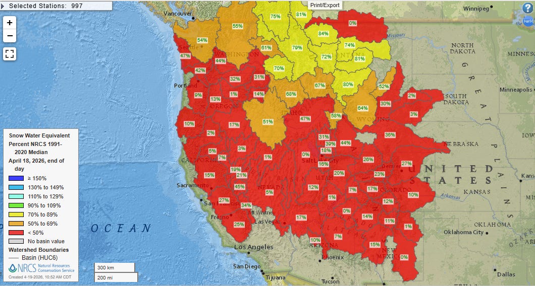 As has been extensively reported in the media in the last several weeks, snowpack is extremely poor over pretty much the entire western United States, with most areas other than the mountains of Washington and the northern Rockies seeing snow water equivalent (amount of water that would result if all snow on the ground were melted) values well below 50% of normal.