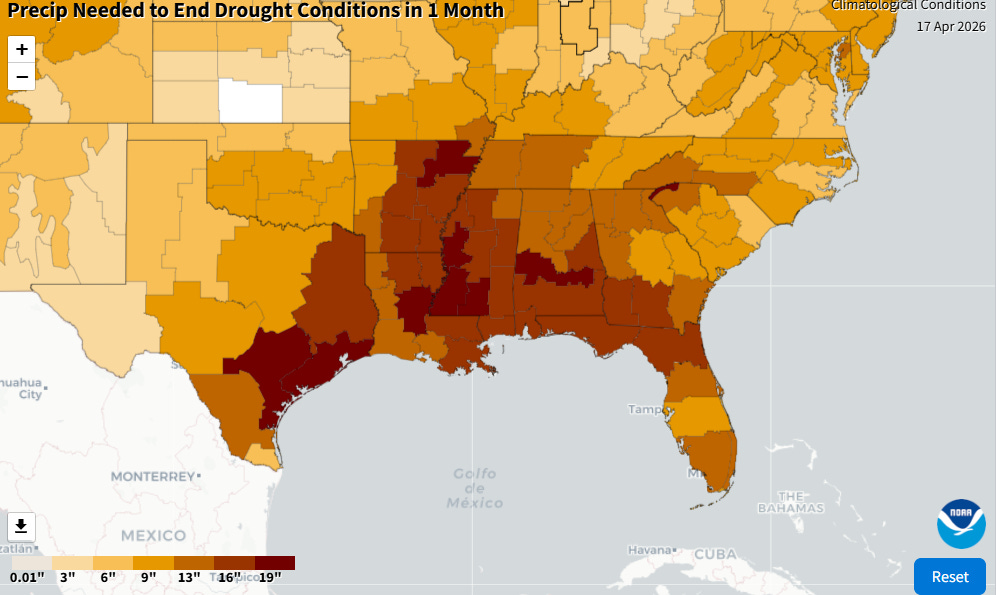 The other two areas of extreme to exceptional drought are in the South, one area running from south Texas to the Mid-South, and the other centered in northern Florida and southern Georgia. Obviously, these regions typically get much more rain than that the West, and these areas have been suffering from chronic below normal precipitation for the last year. Many areas now need more than a foot of rainfall to relieve the long term drought conditions. This has serious implications for water supply (e.g., Corpus Christi severe water crisis) and wildfire potential. Spring is the typical peak of wildfire season in Florida and surrounding areas, and there have already been significant issues with wildfires in recent weeks in the state. Dry and record warm temperatures in the last several days (Atlanta reached 90F on its earliest date on record Friday) has exacerbated the short term situation, and elevated wildfire conditions are expected across this region in the coming days.
