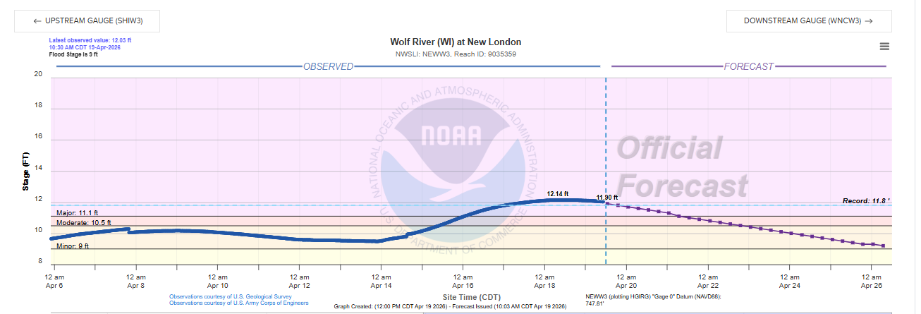 Record flooding is also occurring in parts of Wisconsin, with the Wolf River at New London reaching a record yesterday (records go back to at least the 1930s).