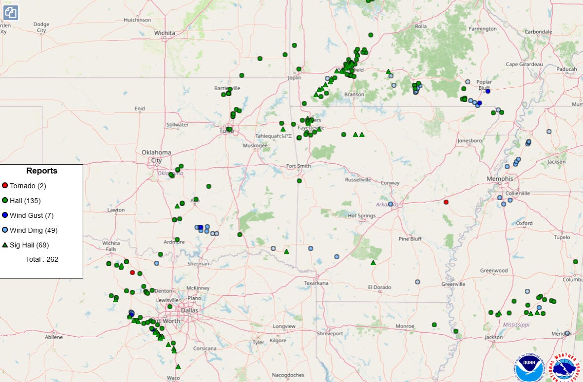 The swath of giant hail associated with this left moving storm is very apparent on the Storm Prediction Center severe weather report map, as well as a swath of significant hail from a southeast moving supercell in the area west and southwest of Fort Worth. Hail up to 3” in diameter also fell in parts of central Mississippi.