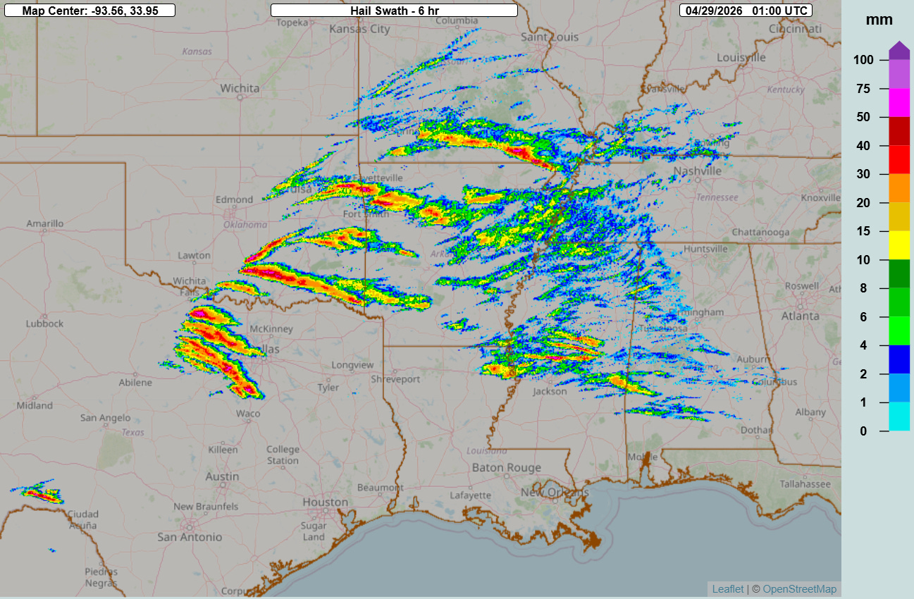 Today was another busy day of severe weather, and once again very large hail was a big issue. This graphic from the NSSL Multi-radar Multi-sensor System (MRMS) shows the swaths of maximum estimated hail size over the 6 hours ending at 8 pm CT, and clearly shows the path of a number of supercell storms producing very large hail from areas of southern Missouri down to the Interstate 20 corridor.