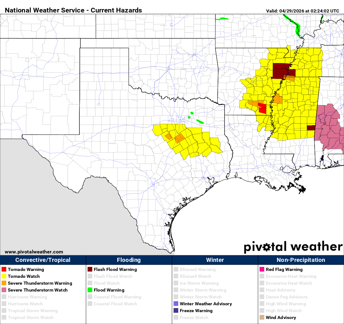 Tornado watches remain in effect into the early morning hours across parts of the South, with several severe storms continuing to move southeast across the region. Localized flash flooding will also be a concern as storms could train repeatedly over some spots. The threat for severe weather should gradually wane later tonight, and after nearly a week of very active severe weather the country will be transitioning to a new weather pattern with lesser (but still some) severe weather risks. More to come on that pattern change in tomorrow’s newsletter.